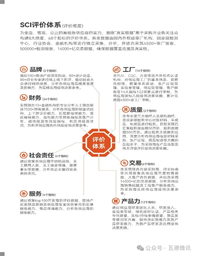 2024年,采筑供應(yīng)商綜合指數(shù)SCI全面升級:1、測評模型優(yōu)化:新增了政府平臺、國央企采購商關(guān)注的綠色工廠、綠色建材、綠色供應(yīng)鏈等測評指標(biāo);2、測評范圍擴(kuò)大:本次測評涵蓋91個(gè)品類,2600多家供應(yīng)商參評,測評的供應(yīng)商數(shù)量增加50%,測評范圍也從供應(yīng)商擴(kuò)展到與之相關(guān)的經(jīng)銷商、安裝商;3、升級并開放SCI智能測評系統(tǒng):可支持采購方自由選擇關(guān)注的指標(biāo)及算分規(guī)則,為客戶提供根據(jù)自身需求定制的評估模型,快速生成評分;4、采信范圍擴(kuò)大:采筑聯(lián)采資信標(biāo)采信SCI測評得分,更多的采購商客戶通過采信SCI測評數(shù)據(jù)進(jìn)行品牌庫建設(shè)。二、SCI三大特點(diǎn):無濾鏡、無雜質(zhì)、無廣告SCI評價(jià)資料真實(shí)。測評資料來自房地產(chǎn)商、設(shè)計(jì)院、建筑單位、檢測機(jī)構(gòu)、金融機(jī)構(gòu)、供應(yīng)商、第三方數(shù)據(jù)平臺等渠道,覆蓋整個(gè)產(chǎn)業(yè)鏈。SCI基于評價(jià)模型對資料進(jìn)行比對和甄別,提升資料的真實(shí)可靠性。SCI評價(jià)數(shù)據(jù)豐富。4500多份供應(yīng)商審廠報(bào)告、50萬余份產(chǎn)品檢測報(bào)告、7500余份財(cái)務(wù)報(bào)表,200多家共建單位線上線下專項(xiàng)測評、上萬大眾參與投票。三、全行業(yè)強(qiáng)推,SCI勢不可擋采筑將SCI評價(jià)內(nèi)容與行業(yè)權(quán)威機(jī)構(gòu)的供應(yīng)鏈管理成果充分結(jié)合,輸出2024《采筑建材行業(yè)指南》,為行業(yè)提供一份客觀公正,能快速摸清產(chǎn)品力風(fēng)向,全方位了解供應(yīng)商實(shí)力的供采合作指導(dǎo)工具書,輔助采購商客戶準(zhǔn)確、快速決策,佐證供應(yīng)商綜合實(shí)力。